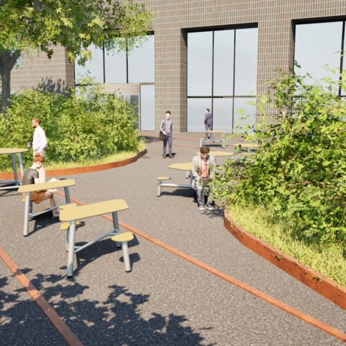 Deze ruimte in het Neunens College krijgt een speelse en energieke sfeer door de dynamische opstelling van onze meubels.